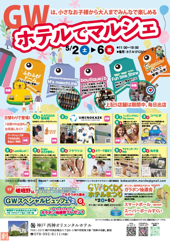 GW ホテルでマルシェ 2026.04.18 今年も神戸市営地下鉄西神中央駅すぐの 神戸西神オリエンタルホテル のロビーにて行われる「GW ホテルでマルシェ」に参加いたします。 潮の風として 5/2 の一日の参加ですが、ネームタグ作りなど、1枚1500円~ワークショップを行いますので、お近くの方はぜひ遊びに来てください(^^)/ 関連記事